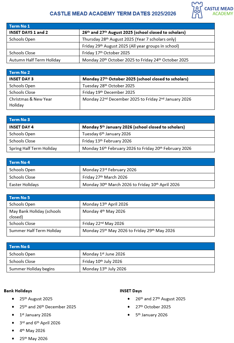 Our current academic year term dates can be found below. Future academic year term dates can be found at the bottom of the page.